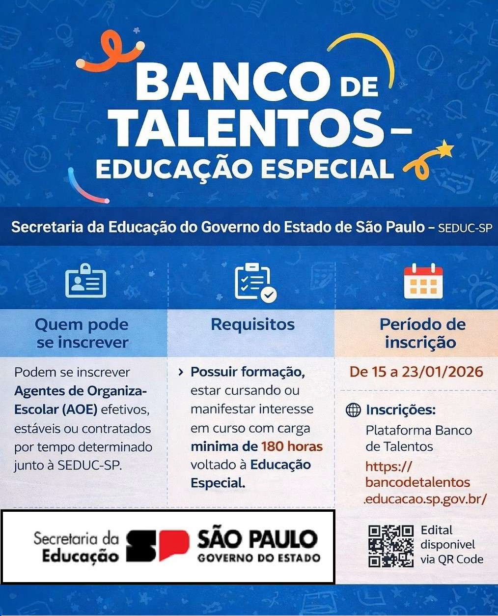 EDITAL – BANCO DE TALENTOS AGENTE DE ORGANIZAÇÃO ESCOLAR – AOE 16-01-26 HISTÓRICO DE OCORRÊNCIAS BANCO DE TALENTOS AGENTE DE ORGANIZAÇÃO ESCOLAR – AOE LEIA TAMBÉM Atribuição Itinerário de Formação Técnica Profissional – IFTP 2026 Processo Seletivo Diretor de Escola ou Diretor Escolar – 2026 Banco de Talentos – Agente de Organização Escolar AOE Processo Seletivo Supervisor de Ensino ou Supervisor Educacional – 2025